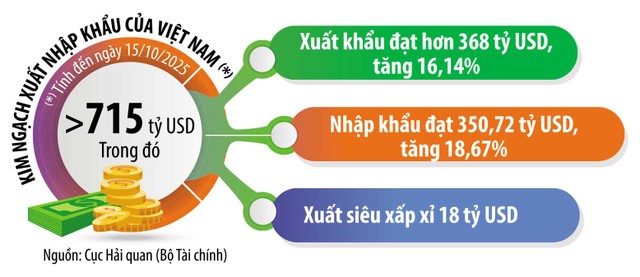 Tính đến trung tuần tháng 10/2025, xuất khẩu hàng hóa vẫn duy trì đà tăng hơn 16% so với cùng kỳ năm trước, đạt khoảng 368 tỷ USD. Kết quả này đang rút ngắn khoảng cách với mốc hơn 405 tỷ USD của cả năm ngoái.