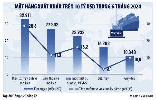 “Quán quân” xuất khẩu là máy tính, điện tử và linh kiện (tăng 28,6%, đạt 32,9 tỷ USD); theo sau là điện thoại - linh kiện (27,2 tỷ USD, tăng 11,3%), máy móc, thiết bị, phụ tùng (22,9 tỷ USD, tăng 16,2%), hàng dệt may (16,3 tỷ USD, tăng 3,1%)...