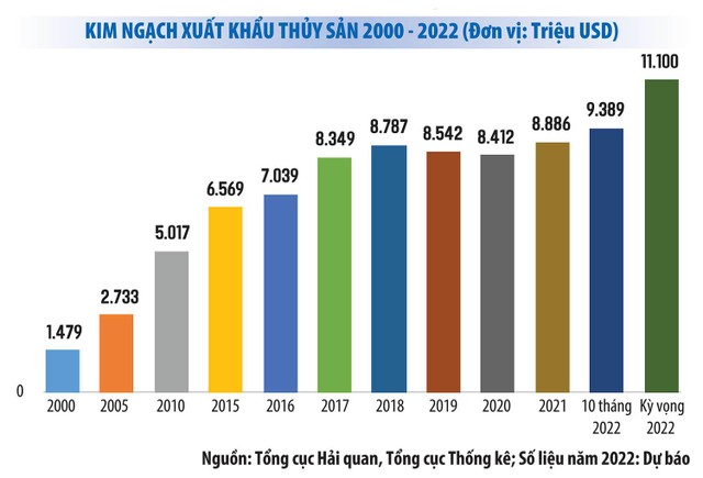 Kim ngạch xuất khẩu thủy sản 10 tháng của năm 2022 đạt 9,5 tỷ USD, cao nhất so với cùng kỳ từ trước đến nay; mới qua 10 tháng đã vượt đỉnh cao nhất trong cả năm thiết lập vào năm 2021. Kết quả này đã góp phần giúp tổng kim ngạch của cả nước đạt mức cao với 312,82 tỷ USD, tăng 15,9% (42,92 tỷ USD) so với cùng kỳ.