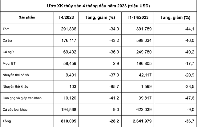 Tình trạng đó khiến cho xuất khẩu thủy sản của Việt Nam sang Mỹ duy trì mức giảm sâu 51% trong tháng 4, khiến Mỹ rớt xuống vị trí thứ 3 trong các thị trường nhập khẩu thủy sản, sau Nhật Bản và Trung Quốc. Lũy kế 4 tháng đầu năm 2023, xuất khẩu thủy sản sang Mỹ ước đạt 418 triệu USD, giảm trên 57% so với cùng kỳ.