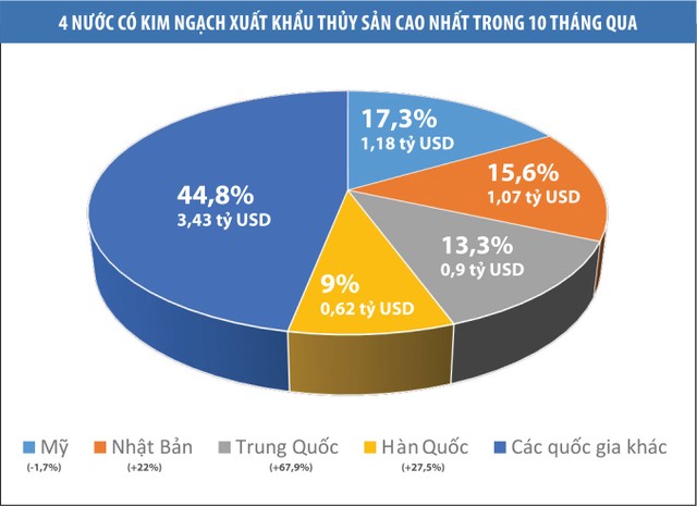 Tại hầu hết các thị trường trọng điểm (45 thị trường), xuất khẩu thủy sản đều đạt tăng trưởng mạnh trong 10 tháng qua. Đặc biệt, thủy sản Việt Nam xuất sang Trung Quốc có sự tăng trưởng đột biến, đạt gần 68%. 4 quốc gia có kim ngạch xuất khẩu thủy sản lớn nhất là Mỹ (chiếm 17,3% tổng kim ngạch), Nhật Bản (15,6%), Trung Quốc (13,3%) và Hàn Quốc (9%). Các nước Đông Nam Á nói chung chỉ chiếm 7,2% trong tổng kim ngạch, đạt 492,43 triệu USD, tăng 17% so với cùng kỳ.