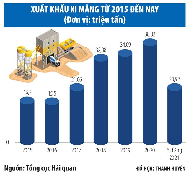 Trong khi nhiều ngành hàng bị chao đảo bởi Covid-19, thì xi măng dường như không chịu nhiều tác động. Ba năm liên tiếp (2018 - 2020), ngành xi măng đều xuất bán số lượng lớn, với giá trị vượt 1 tỷ USD/năm, riêng năm 2020 xuất khẩu hơn 38 triệu tấn, trị giá 1,46 tỷ USD.