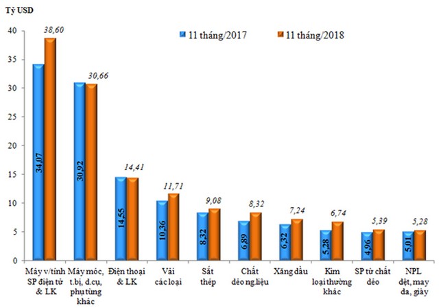 Trị giá nhập khẩu 10 nhóm hàng lớn nhất trong 11 tháng đầu năm 2018. Nguồn: Tổng cục Hải quan
