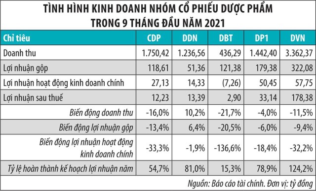 Thực tế, trong 9 tháng đầu năm 2021, 5 công ty dược phẩm có giá cổ phiếu tăng mạnh trong 2 đợt sóng đều có tình hình kinh doanh đi xuống. Cụ thể, doanh thu trung bình giảm 8,6%, lợi nhuận hoạt động kinh doanh chính (lợi nhuận gộp - chi phí bán hàng và quản lý doanh nghiệp) giảm trung bình 44,5% so với cùng kỳ năm 2020.