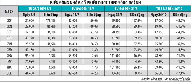Trong nhịp tăng đầu tiên từ ngày 25/5 đến 8/6, nhóm cổ phiếu dược phẩm tăng trung bình 50,5%, nhưng sau đó nhanh chóng giảm 20,8% trong thời gian từ 8/6 đến 13/7. Sau thời gian nghỉ ngơi, nhóm cổ phiếu này lại có đợt sóng thứ hai trong tháng 8 (diễn ra từ 6 - 31/8).